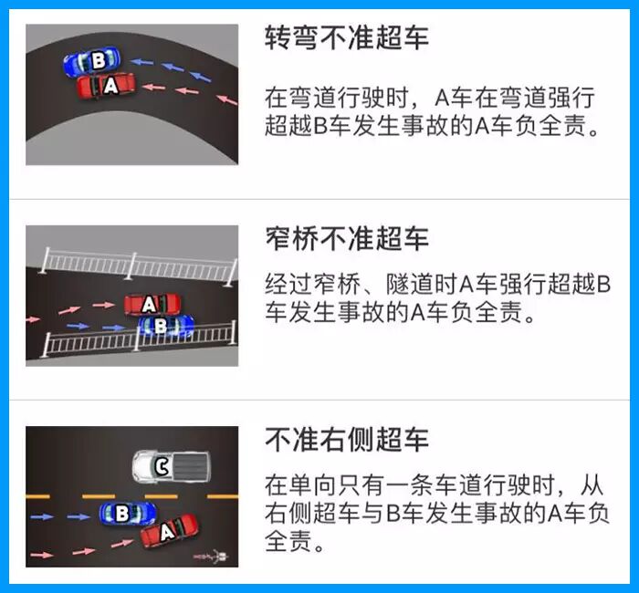 在弯道、窄桥等道路是不允许超车的,如果强行超车造成事故,那么您将负全责。在单向一条车道的道路上行驶时,切忌右侧超车,如果发生事故您也将负全责。超车时我们应观察对向是否有车,判断没车后,可以打转向灯再鸣笛或晃大灯告知前车您要超车,正常情况下前车司机都会靠右行驶予以避让。