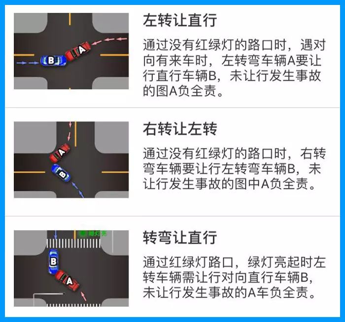 在考驾照的时候,教练告诉过我们一句话:“转弯让直行”。以上的几种情况,转弯车辆未让直行车辆需负全责,右转车辆未让左转车辆需负全责。如果我们能记住“右转让左转、左转让直行”这句话,上面的事故就不会发生了。