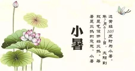 小暑,太阳黄经:105°,这时天气已经很热了,但还不到最热的时候,所以叫小暑。《月令七十二候集解》:"六月节……暑,热也,就热之中分为大小,月初为小,月中为大,今则热气犹小也。"暑,表示炎热的意思,小暑为小热,还不十分热。小暑后北方应注意抗旱,南方须注意防涝。全国的农作物都进入了茁壮成长阶段,我国古代将小暑分为三候:"一候温风至;二候蟋蟀居宇;三候鹰始鸷。"