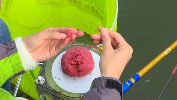在打揉的过程中,如果发现饵料不够软,还可以用手沾水,不断地滴撒在饵料上,然后再继续打揉,需要特别注意的是,每次沾水的量不能过多,以免破坏搓饵的状态。