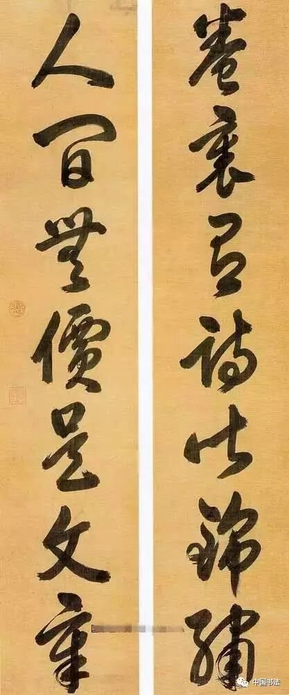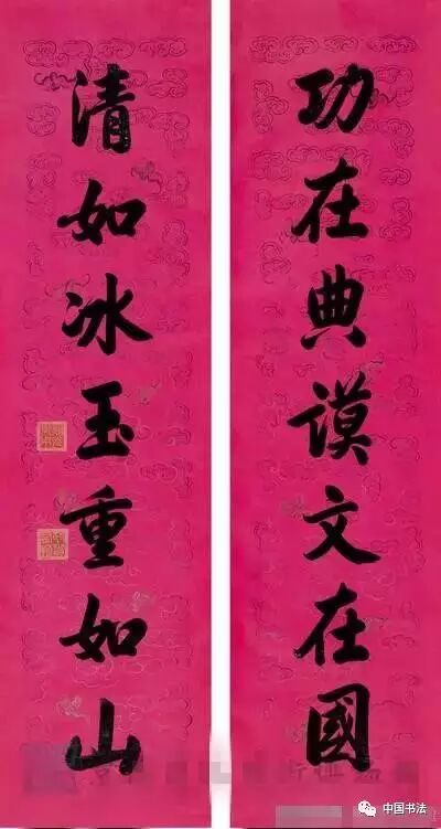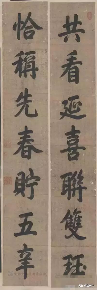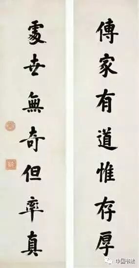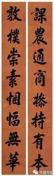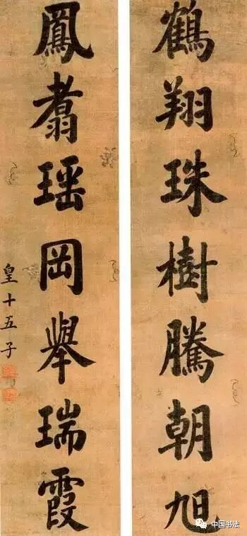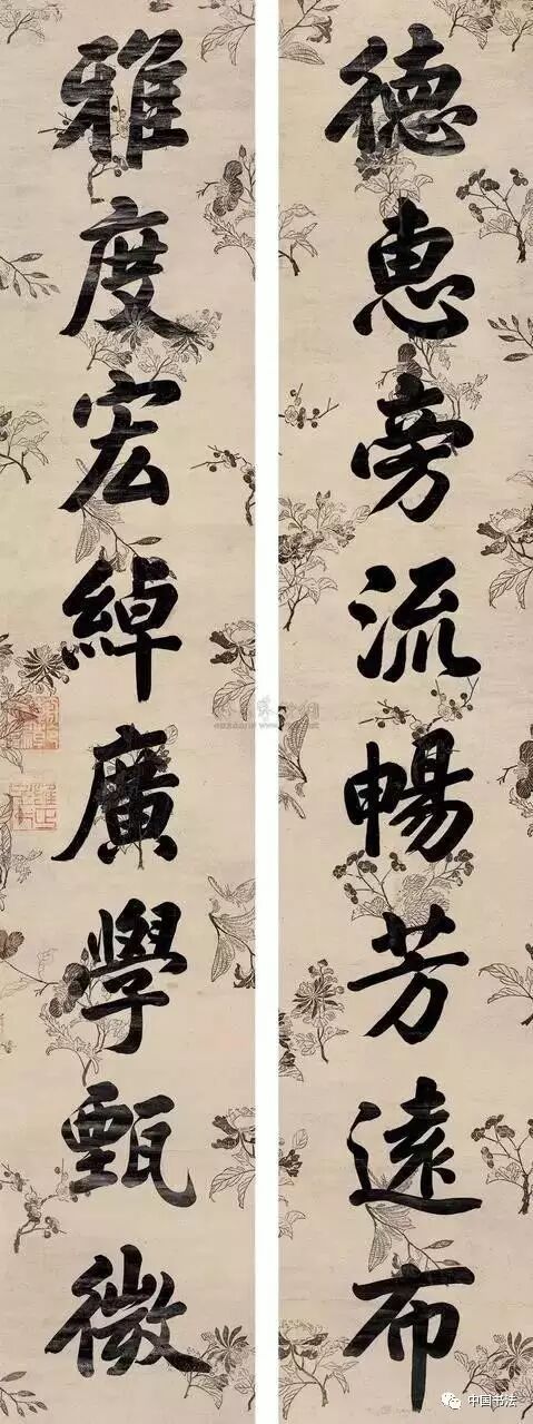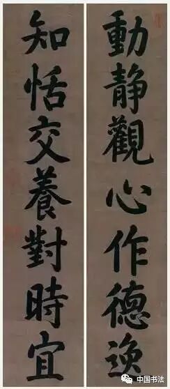 道光皇帝是清代唯一一位以嫡长子身份即位的皇帝。道光皇帝恪勤於治,万机之余,亦以书画自娱。从下面书法对联看,其书法於颜鲁公用力甚多,复用力於虞世南、赵松雪等松秀一路,结体开阔端庄,点画凝重浑厚,气象静穆,自有一种富贵雍容之度。