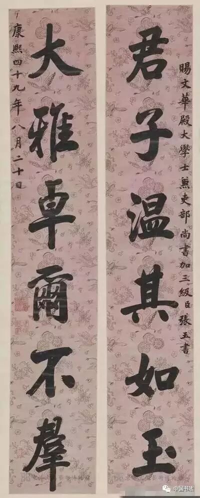 康熙帝,名爱新觉罗·玄烨。顺治帝第三子。康熙是历史上在位时间最长的皇帝。此联是康熙御书赐予文华殿大学士张玉书的,张是《康熙字典》总裁官,他为官谨慎廉洁,远避权势,为康熙帝所重用。从联语可见康熙帝对张玉书的赞赏之意溢于言表。康熙用笔结字肥厚丰满,时出苏轼笔意,其字雍容中正,极具帝王之气象。