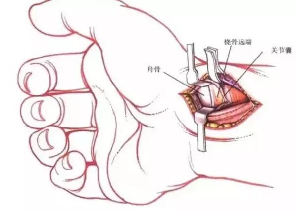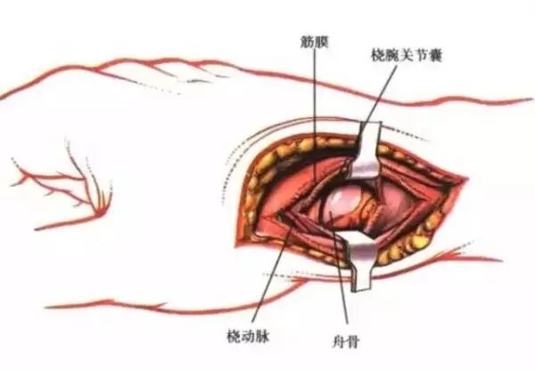引流切口在腕掌,桡侧腕屈肌近旁;