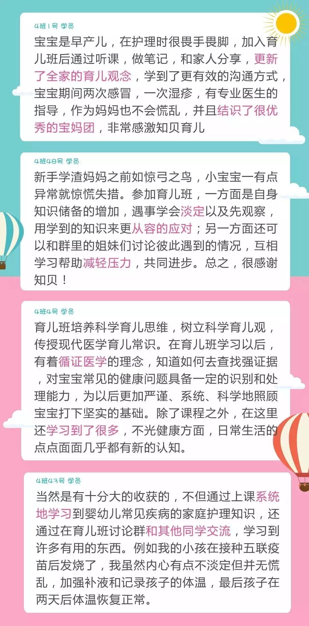 不要觉得育儿班的学费贵,我女儿现在4岁多了,我对现在孩子“早教班”“兴趣班”的行情比较了解,随便一个都起码是一两千元起,贵的甚至上万元,这些早教班、兴趣班其实一般只是让孩子们去玩玩,知贝的育儿班可以给家长们培养真正科学的育儿理念,这才是真正“赢在起跑线”。甚至在备孕阶段就可以夫妻俩一起去学,对科学育儿达成一致的共识,那是再好不过了,不然根据经验,在孩子出生后很容易因为育儿理念不一致而出现矛盾;当出现矛盾的时候,你就会知道,这点学费真的不算什么,看看下面知贝育儿4班学员的评价及感受吧: