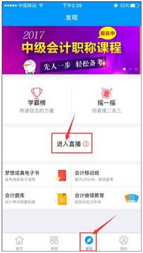 1、手机端:首先需要下载“会计移动课堂”并安装(扫描二维码下载),然后登录进入移动课堂——>发现——>进入直播——>进入教室。