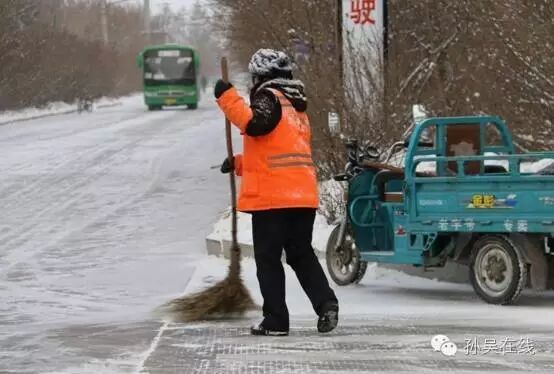 每个雪花飞舞的日子里,孙吴小城的大街小巷都未曾被厚厚的积雪覆盖,你不知积雪是何时被清理的,亦不知街道是何时被清扫干净,只知道当我们还在被窝里享受温暖时,他们已经开始为我们可爱的小城进行“洗漱化妆”,他们就是可敬的“城市美容师”——环卫工人。