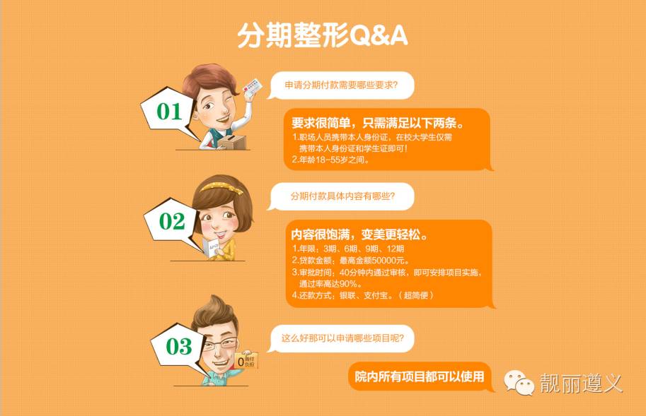 举例2:分期适用于正品医美项目,假如你做了假体隆鼻5000元,又垂涎祛斑套餐12000元,但又囊中羞涩,那么你可以先缴费5000元,剩余12000元可申请整形分期,按6期计算,月供仅需2000元。
