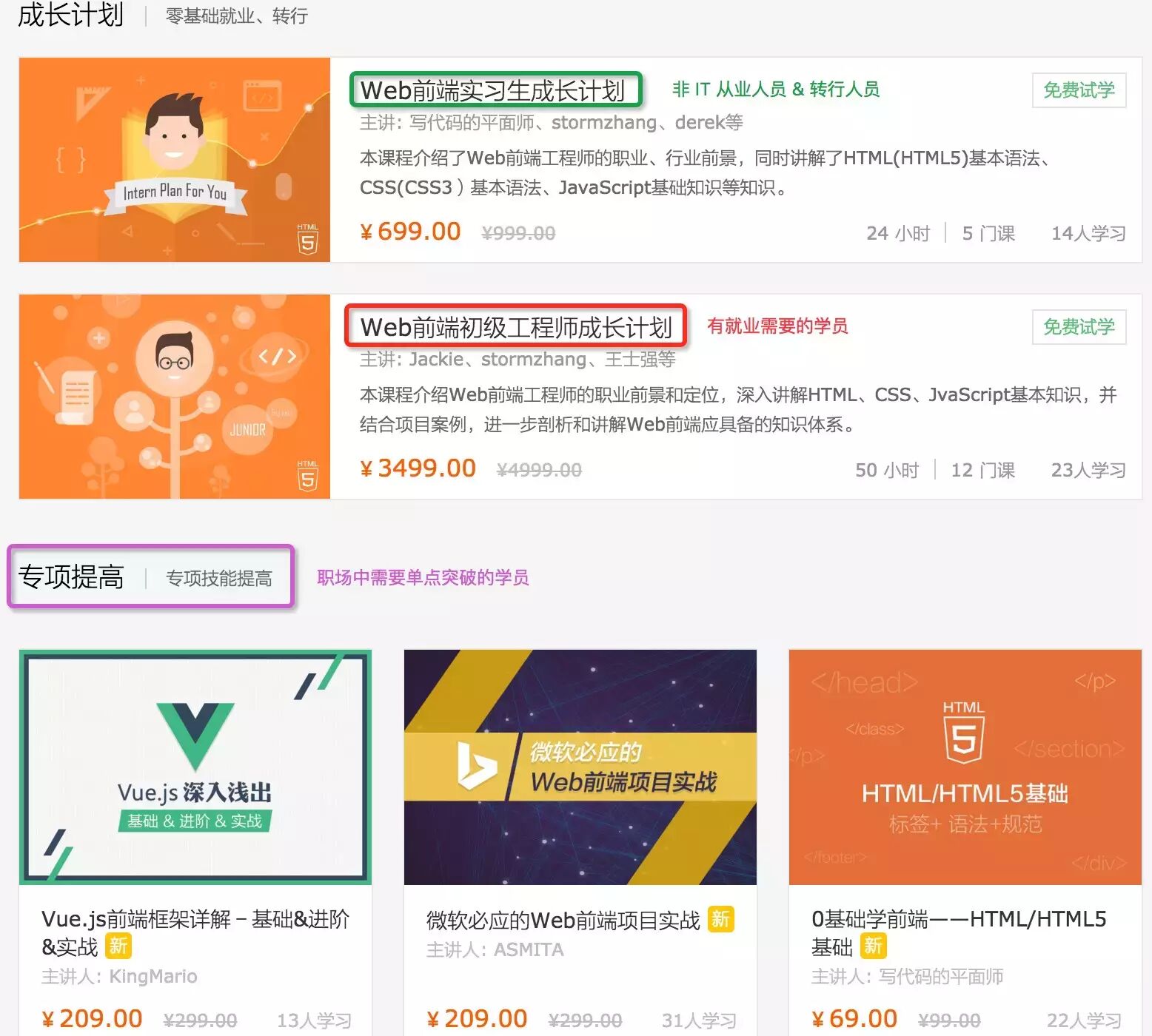 第一期共上线 4 门,分别是 Web 前端工程师、Python Web 工程师、Go 语言工程师 和 iOS 工程师。