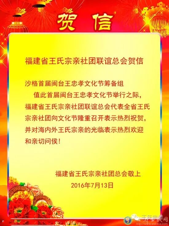 值此首届闽台王忠孝文化节举行之际,福建省王氏宗亲社团联谊总会代表全省王氏宗亲社团向文化节隆重召开表示热烈祝贺,并对海内外王氏宗亲的光临表示热烈欢迎和亲切问侯!福建省王氏宗亲社团总会敬上