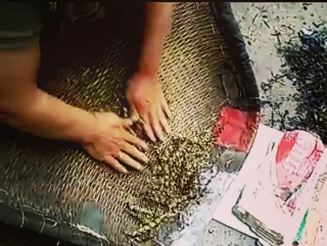 将烧好的麦穗放进簸箕揉搓,进行脱粒