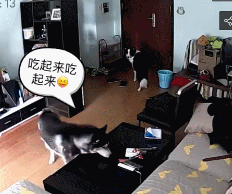 二哈马上付诸行动,准备偷吃,一旁的边牧着急了,立马警告二哈!