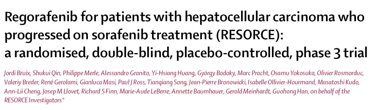 本项随机、双盲、安慰剂对照、3期临床试验在21个国家的152家机构进行。主要纳入标准包括:肝细胞癌患者;对索拉非尼治疗耐受(药物剂量≥400 mg/日,最近28天内至少使用20天);索拉非尼治疗期间发生疾病进展;肝功能为Child-A级。应用电脑生成随机化列表和交互式语音通话系统进行随机。根据地区、美国东部肿瘤协作组评分、大血管侵袭、肝外疾病和甲胎蛋白水平对受试者进行分层。按2:1的比例,将患者随机分配至瑞戈非尼组和安慰剂组。瑞戈非尼组:最佳支持治疗联合瑞戈非尼,160mg/日,口服;安慰剂组:最佳支持治疗联合安慰剂;每4周为一个周期,每周期的1-3周进行治疗。研究者、受试者、资助者均对治疗分组均不知情。主要观察终点为总体生存,其定义为随机至死亡的时间。采用意向性治疗分析。本研究已在ClinicalTrials.gov注册(NCT01774344)。