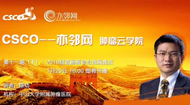 1月20日16:00陈功教授【CSCO-亦邻网肿瘤云学院第十一期(下)】2016 结直肠癌诊治进展盘点直播!欢迎报名参加!