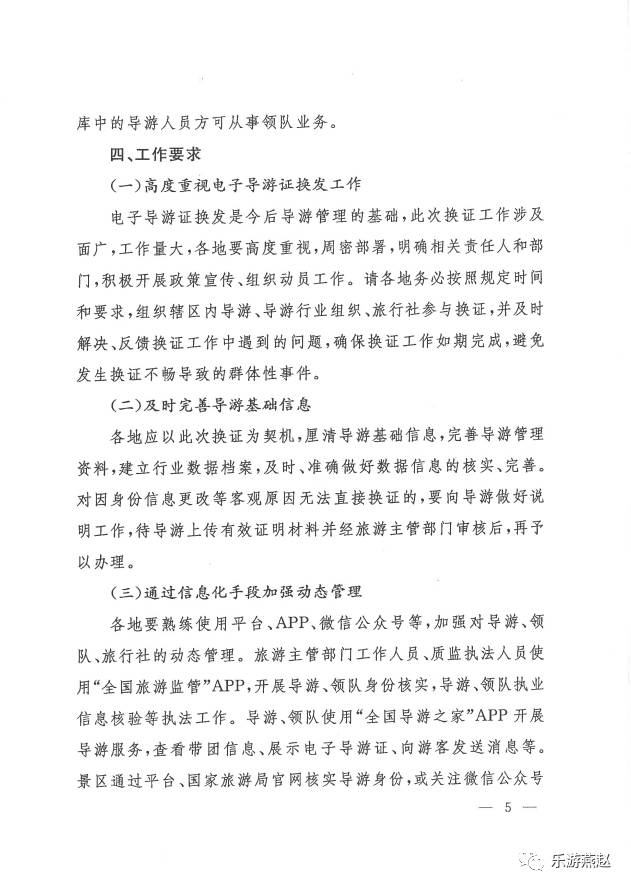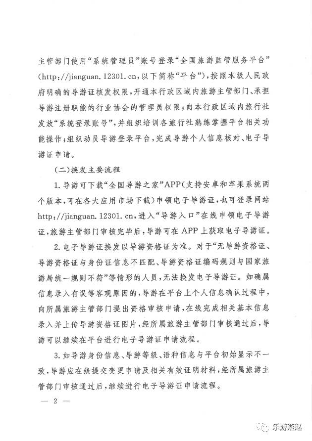 《通知》指出,3月份,各省(自治区、直辖市)、://jianguan.12301.cn,以下简称“平台”),按照本级人民政府明确的导游证核发权限,开通本行政区域内旅游主管部门、承担导游注册职能的行业协会的管理员权限;向本行政区域内旅行社发放“系统登录账号”,并组织培训各旅行社熟练掌握平台相关功能操作;组织动员导游登录平台,完成导游个人信息核对、电子导游证申请。