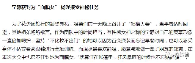宁静是出名的面膜达人,她在《花儿与少年》就天天敷面膜,甚至在帐篷里,狂风暴雨也要敷面膜。
