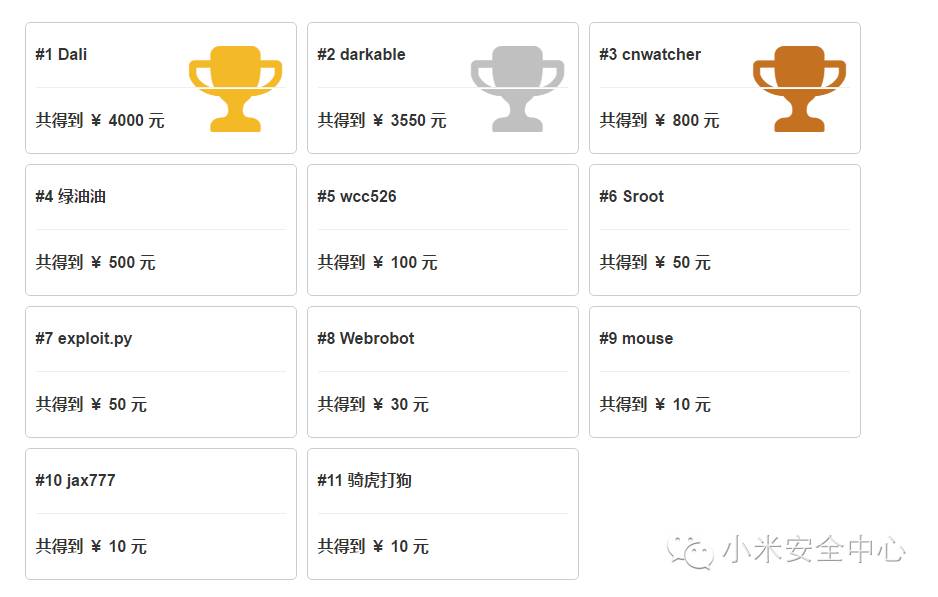 最后再次感谢所有提交过漏洞和威胁情报的安全专家们,感谢你们对小米安全中心(MiSRC)的关注,保障了小米用户的安全在线生活。 同时欢迎更多的安全专家,安全爱好者,白帽子反馈小米的安全漏洞和威胁情报。