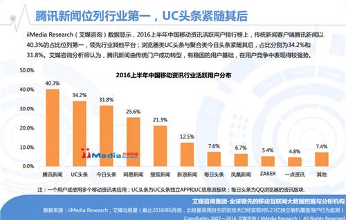 艾媒咨询发布《2016上半年中国移动资讯市场研究报告》,在报告中显示腾讯新闻客户端以40.3%的活跃用户占比位列行业第一,UC头条以34.2%的占比紧随其后,今日头条活跃用户占比达31.8%,排名第三。