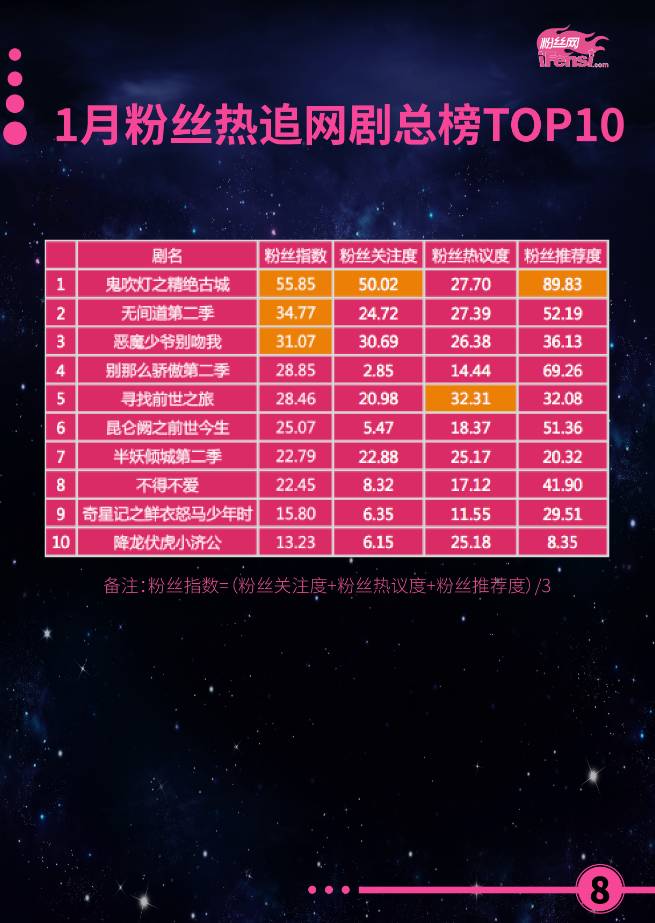 1月粉丝热追影视榜成绩整体表现平稳,影视剧的整体成绩相对稳定,三大热剧登总榜TOP3,古装、玄幻热度不减。