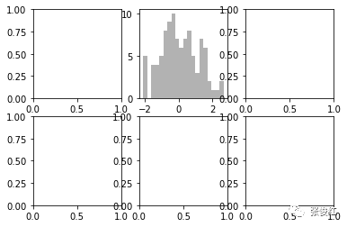_=axes[0,1].hist(randn(100),bins=20,color='k',alpha=0.3)#加“_=”视为让其不输出randn产生的随机数组