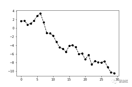 plot(randn(30).cumsum(),color="k",linestyle="--",marker="o")