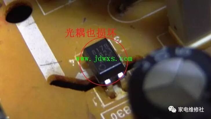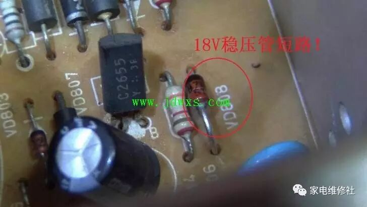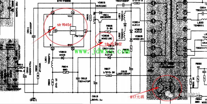 | 接修此机时,上电开机没反应,指示灯也没亮。拆盖抽出电路板时,见底下很多蟑螂 在动!只好先把蟑螂消灭后,再来检测电源部位了。见3.15A保险已烧黑!用表测电容C810两端阻值为0,说明厚模块STR F6454已击穿,拆下测量此元件的3脚与5脚已短路了。随后在线检测其他可疑元件时,发现稳压管VD808(18V)已短路!皆换新。 为了防止电源部位还有其他损坏元件没查出来,怕通电后电压过高,烧坏其他的元件,只好断开行管C极,在+B处接上100W灯泡负载,进行试机。结果上电开机,只见灯泡闪一下即灭!说明稳压电路还有问题了。拆下光耦817,用10K档测光耦3、4脚,正反都无穷大,说明开路了。速换之,开机,见灯泡暗亮,测+B电压70V左右,说明是待机状态。按面板节目+键,只见灯泡光亮多了,测灯泡两端电压为120V,正常。恢复电路,上电开机,电视图声出现。维修完毕,谢谢观赏! 小结:此机由于蟑螂爬在电源供电电路底部,引起漏电短路而损坏的元件,没什么规律可源,只能在线检测,并运用原理分析,从而达到快速修复。 |