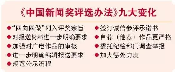 一是将“四向四做”列入评奖宗旨。、长江韬奋奖获奖者代表时发表的重要讲话精神,。二是对报送材料进一步明确要求。中国新闻奖参评作品材料以及作品刊播信息(刊播时间、栏目、版面等)必须与刊播时一致。三是加强对广电作品的审核。要求参评人务必妥善保存广电类参评作品的首发播出栏目原版以及参评作品和所在栏目的内部编辑、制作和播出审批凭据(含数字系统编审痕迹)。四是在《评选办法》中进一步明确对编辑的报送要求,在消息类、新闻摄影项目中,应报1至2名编辑;在广播、电视作品等项目中,强调主创人员应包括编辑。五是规范公示流程。要求各单位完整公示拟参评作品的全部申报材料,并在申报时提供每件作品公示网页地址备查。六是签订诚信参评承诺书。每个报送单位、每个参评人必须签订诚信参评承诺书。七是,且须有2名新闻专业副高及以上职称的人士实名推荐。八是中国记协评奖办公室负责受理公示期间有关举报,按照本办法规定对举报事实进行认真核查,并委托相关地方主管单位纪检部门介入调查,提出处理意见报评委会主任会决定。九是加大惩处力度。对违规参评作品一经查实,即撤销该作品参评或获奖资格;对推荐单位和报送单位予以通报批评,被通报的推荐单位、报送单位不得参加下一届该项目评选。