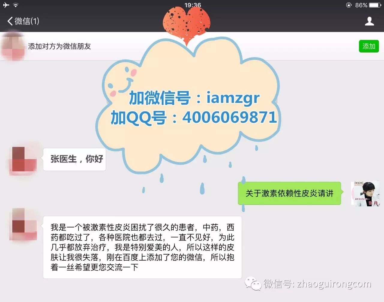 如果您有关于激素依赖性皮炎(激素脸),敏感性肌肤,过敏性皮肤,痤疮等皮肤问题,可以在线留言或者添加微信号:iamzgr、添加QQ号:4006069871进行咨询。赵桂荣药妆一直在这里等着您,赵桂荣药妆愿意做您治疗激素依赖性皮炎的最后一站。