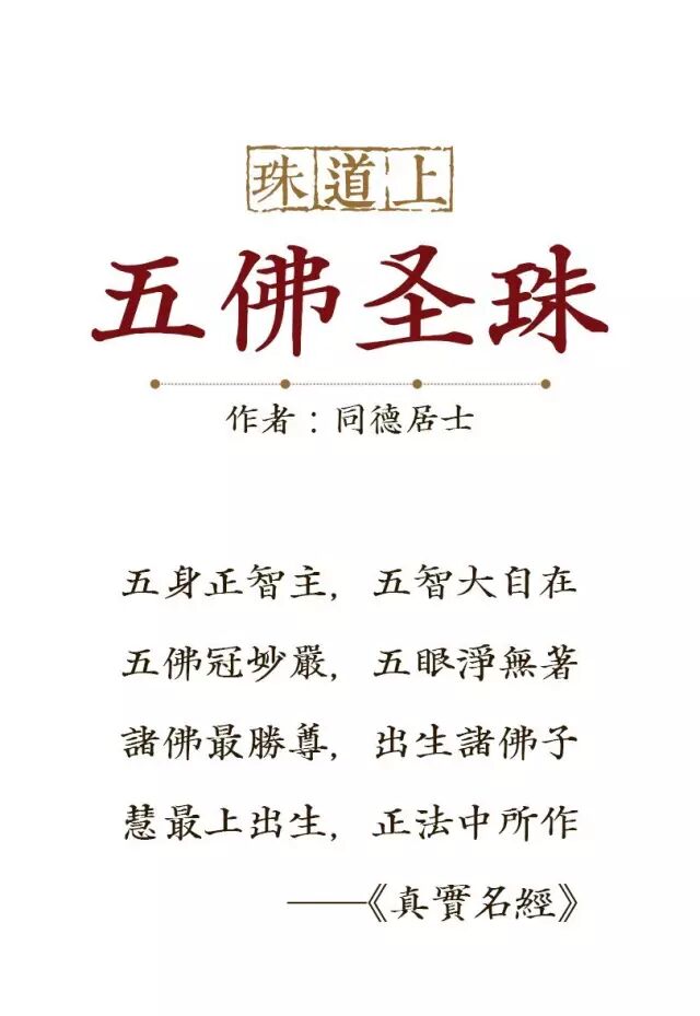另一方面,十几年来,我一直在从事佛化艺术创作,在创作佛珠作品时,常常于佛珠经典钻仰耽味,发现:佛珠教法竟是通向五佛的奇径,这一能带我们通向法身五佛的佛珠经典教法,我们称之为“珠道”。