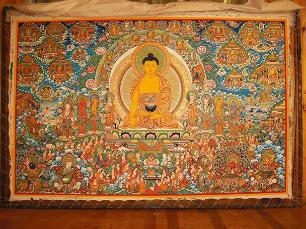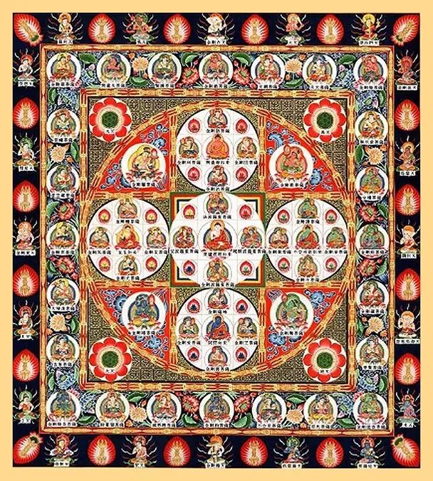 五方佛所在的最极清净、究竟安乐的涅槃世界,名为金刚界,其体系广大磅礴,包括佛1036尊,菩萨297尊,忿怒身4尊,执金刚神4尊,外金刚部120尊,合计1461尊。