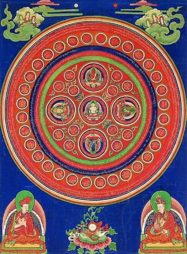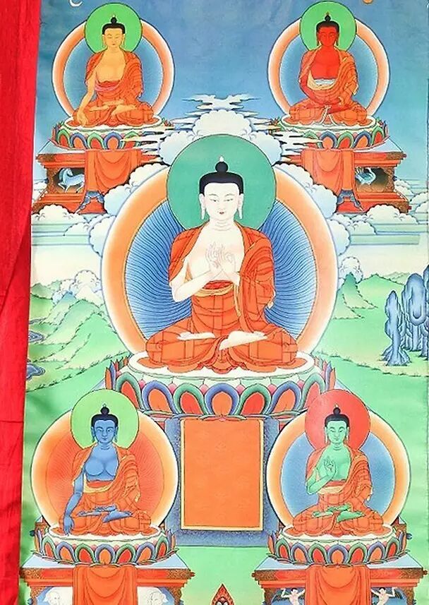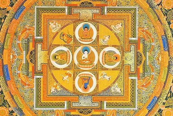 五方佛被藏传高度重视,在藏传的教法与圣地中,随处可见五方佛。图中,是藏传的五佛坛城。
