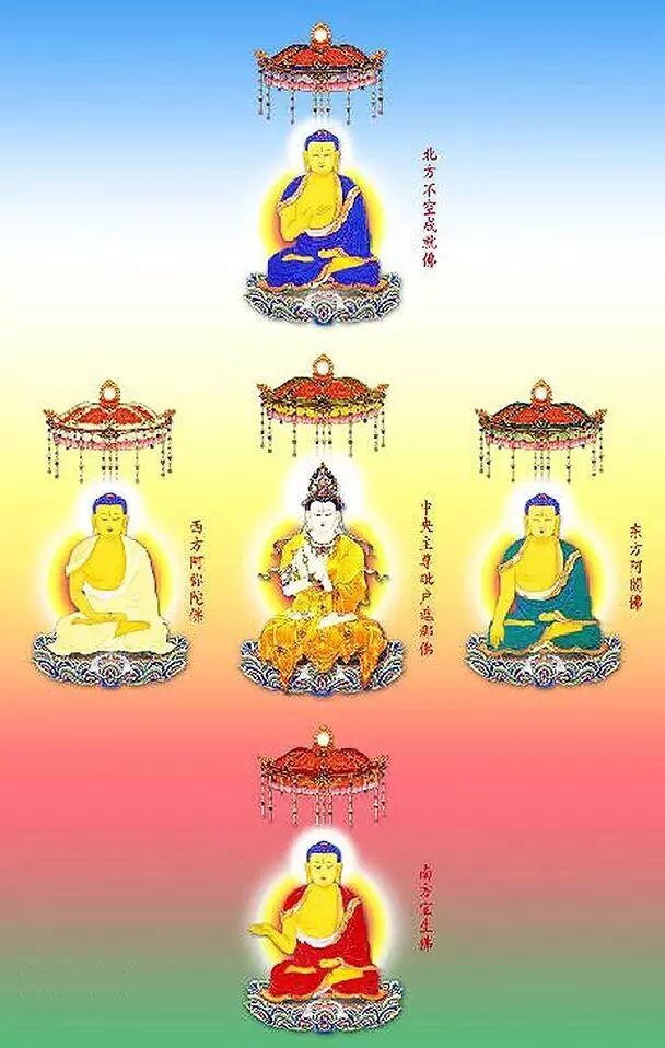以毗卢遮那如来为核心的五方佛,是一切无量诸佛的出生处:一切化身佛,都是从五方佛化出;一切报身佛,也都是从五方佛化出。可以说:五方佛是一切佛的母体,最极究竟!所以中说:“十方三世一切佛,毗卢遮那一佛摄ⅱ”。