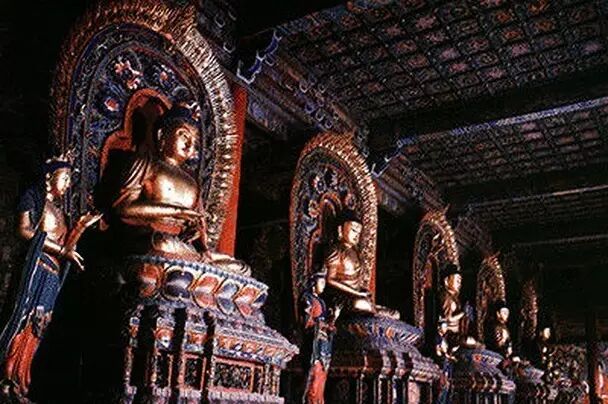 辽、元、明、清几代的皇宫中,也极为尊崇五方佛尊,图中是大同上华严寺的五方佛,寺院始建于辽。
