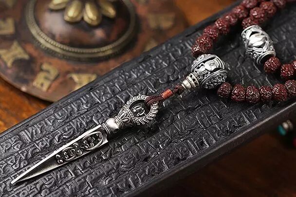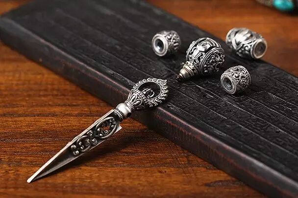 这是我们研制的一套五方佛佛珠,主珠分别为五佛部的材质,并配金刚橛坠饰,金刚橛的橛头处,分别为五佛法器。