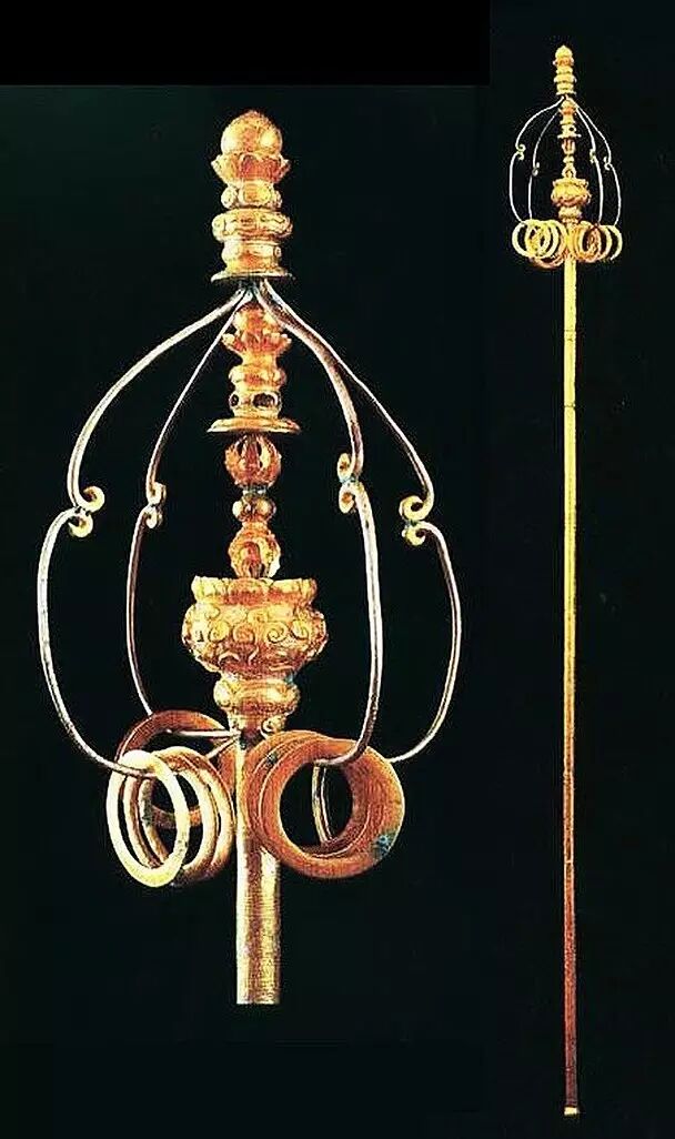 这是法门寺出土的唐代鎏金迎真身银金花四股十二环锡杖,四股代表四佛,。