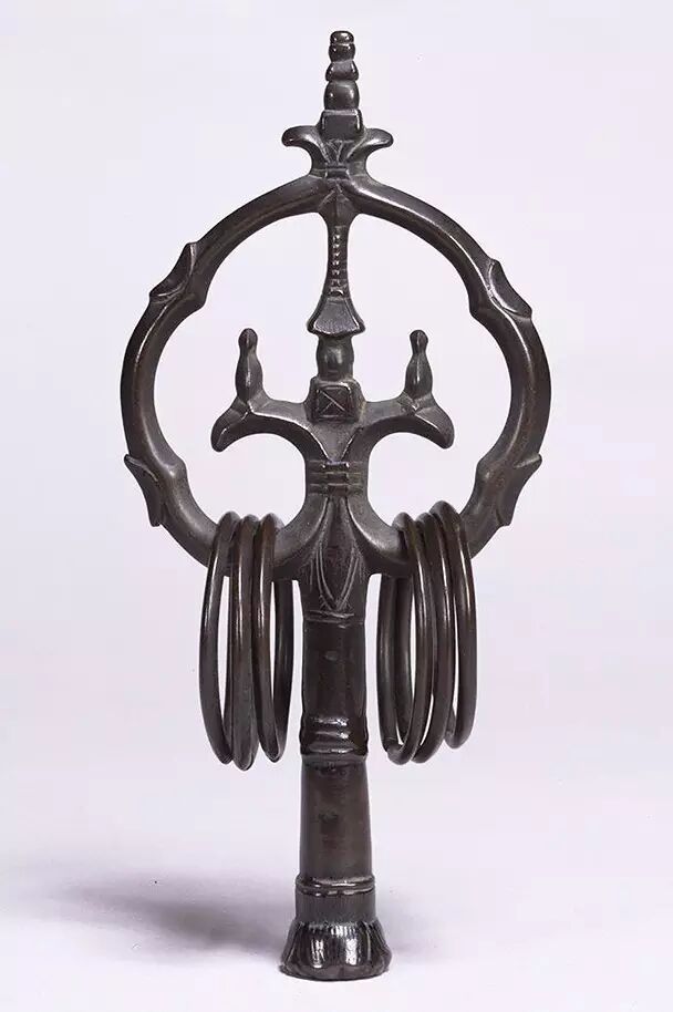 这是日本13世纪的双股六环锡杖头,其最顶端可以看到代表五方佛的五轮塔。