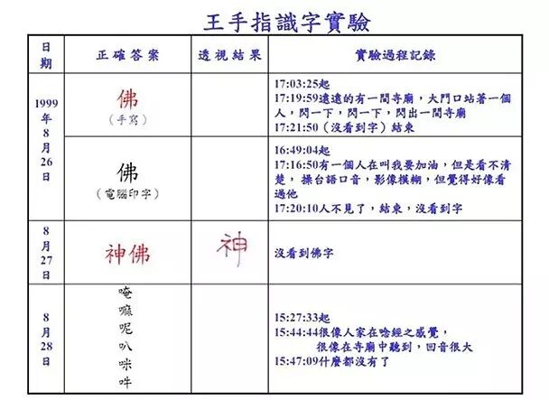 (图:李嗣涔教授的手指识字试验结果表)