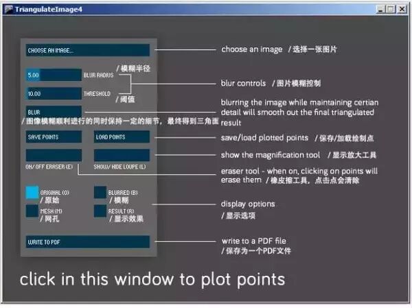 image Triangulator的界面如下,使用方法很简单,就是插入一张带渐变的图片,然后在图片上点击,就可以快速制作。具体去尝试一下就知道了。