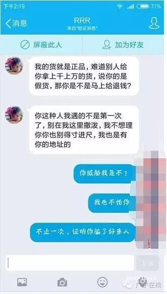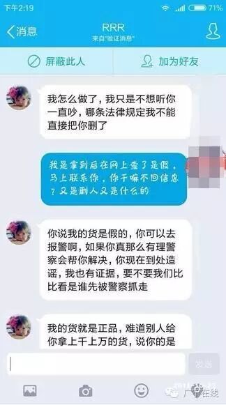 我们收到一位广宁美女的报料,她通过微商购物发现是“流嘢”假货外,本想退货了事,但,却遭拒绝并拉黑,更严重的是,竟然威胁“小心你孩子”。目前,已收集证据,打算将此事报警处理。请看以下她的报料: