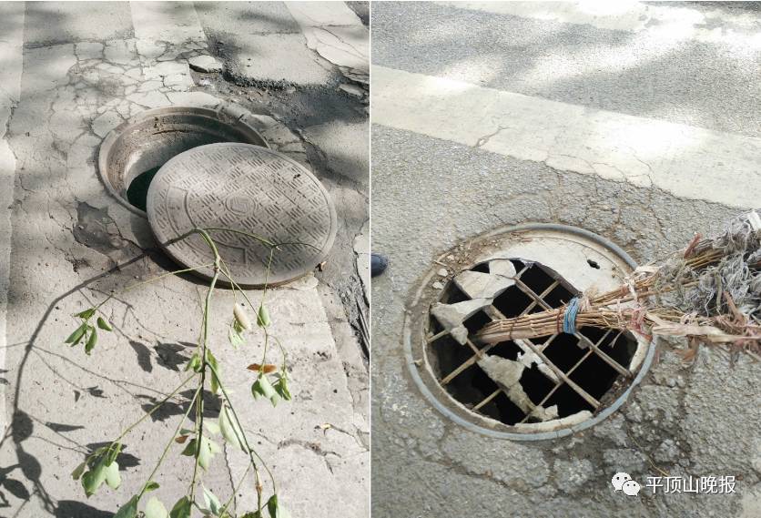 4月17日上午,市区光明路与曙光街交会路口西侧,机动车道旁出现了一口窨井,井盖已移位。为防止行人跌入,有市民临时插上了树枝以作提醒(图左)。记者看到该窨井盖上写有“中国移动”字样。无独有偶,在市区中兴路与曙光街交会路口北侧,一口窨井出现破损下陷,只留下几根钢筋支撑,过往车辆纷纷绕行唯恐发生意外。这个窨井也被人插上了扫帚,以提醒路人小心(图右)。据市政维修人员介绍,这两个窨井是公共设施窨井,有主管部门负责,他们已经通知相关单位尽快修复。窨井伤人多次发生,市政维修二队提醒相关部门,定期检查公共窨井盖是否缺失,如不及时修复将面临被处罚。平顶山晚报记者 张鹏 摄