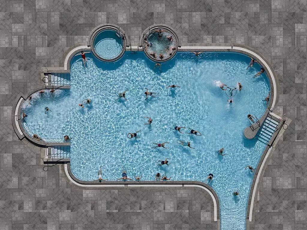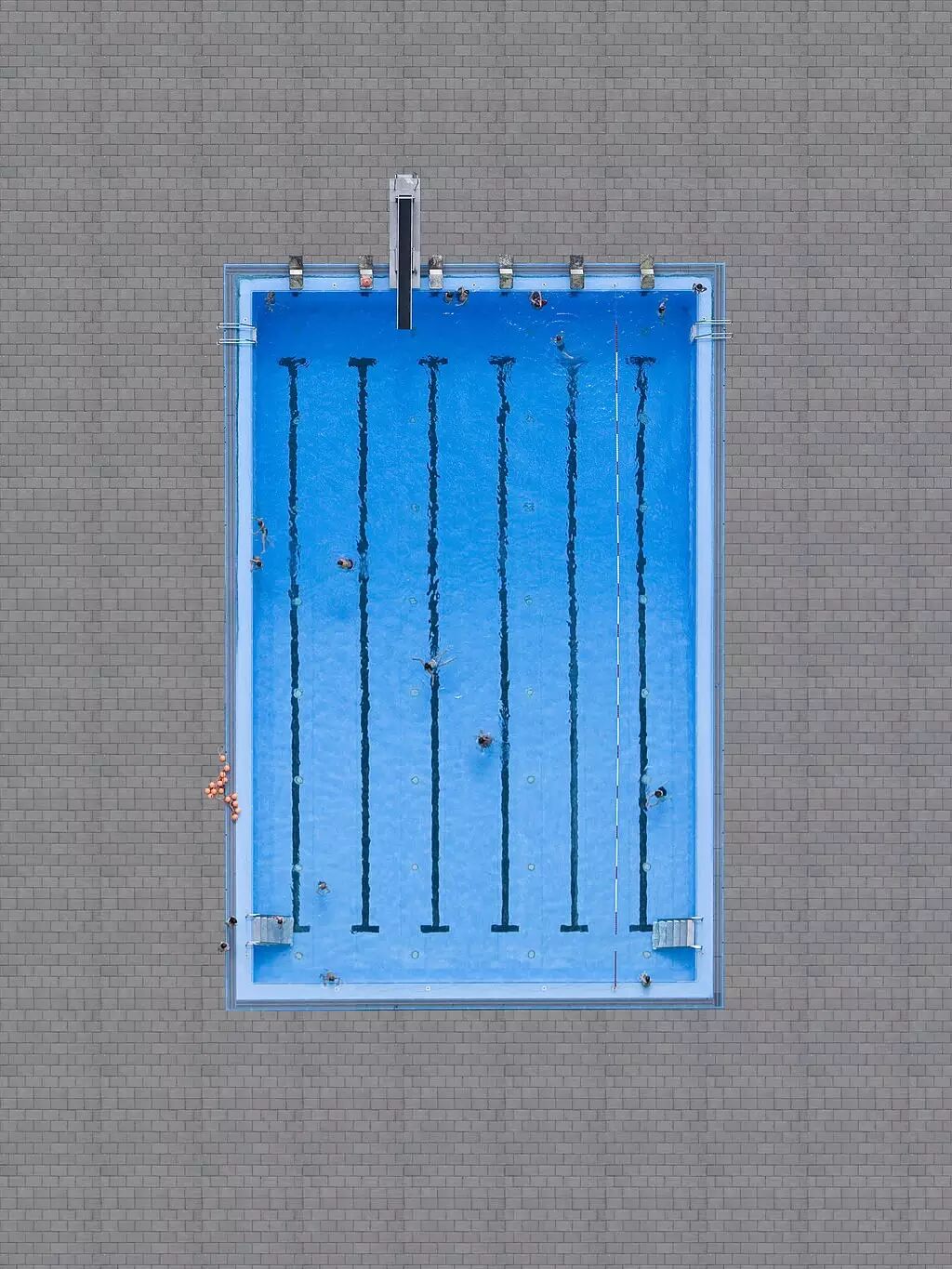 摄影师Stephan Zirwes乘坐着直升飞机,游遍了德国南端的户外游泳池,从高空拍下了这一系列视角独特的游泳池照片。摄影师用photoshop把砖片的范围扩大,让人在视觉上更加专注于泳池和游泳者本身。这些照片,就像是游泳池们的证件照。你会发现它们的全貌竟然如此的美丽又可爱。独有的蓝色面孔,白色的水花又或者是泛起涟漪的水面,遮阳伞和游泳者所点缀出来的色彩,无论当头的烈日多么灼热,依然能从这些静止的图像里感受到一阵阵清凉。