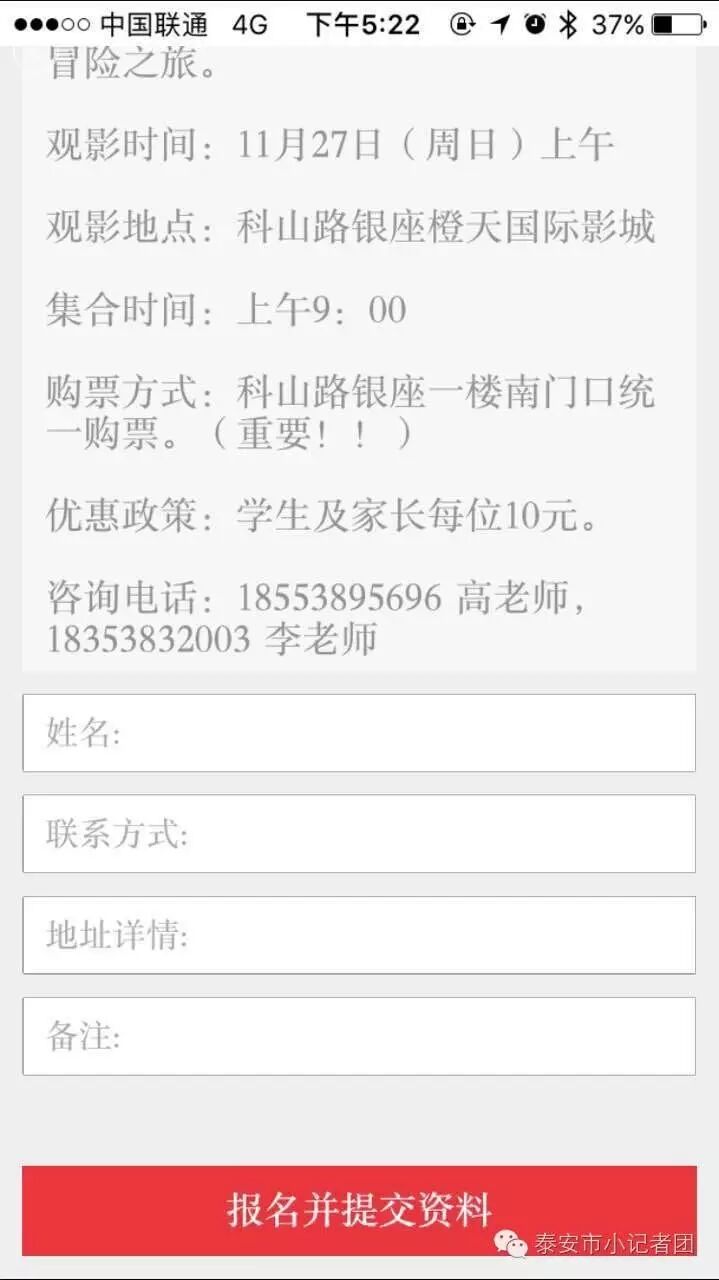 发短信报名,提供小记者姓名和观影人数即可,或通过最泰安客户端报名