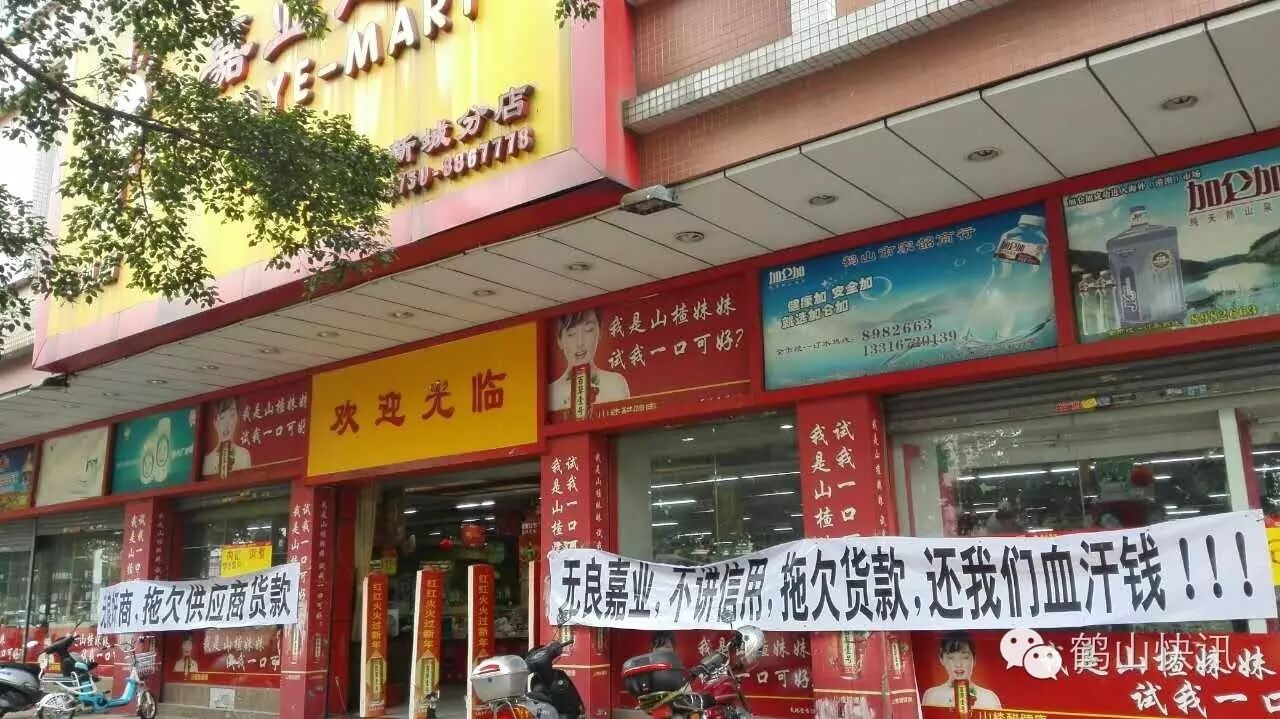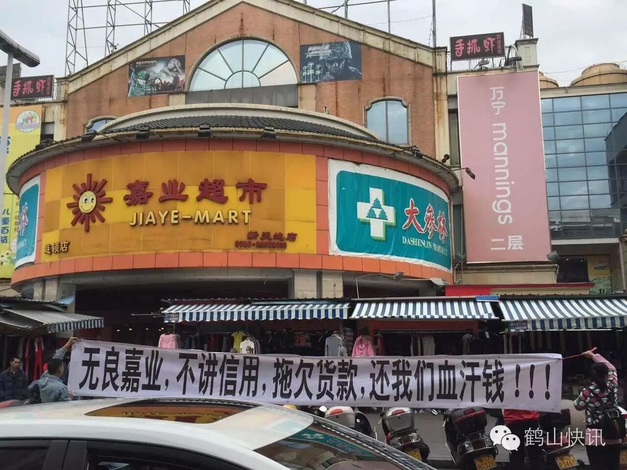 据网友报料:今天12月3日早上,开车经过鹤山沙坪新天地门口路段,发现有人拉起横额,写上“无良嘉业,不讲信用,拖欠货款,还我们血汗钱”,据街坊称,嘉业超市拖欠多个供货商的货款过百万元,供货商们今早上门拉横额,目的想让嘉业老板站出来给个说法!希望双方和平协商解决!
