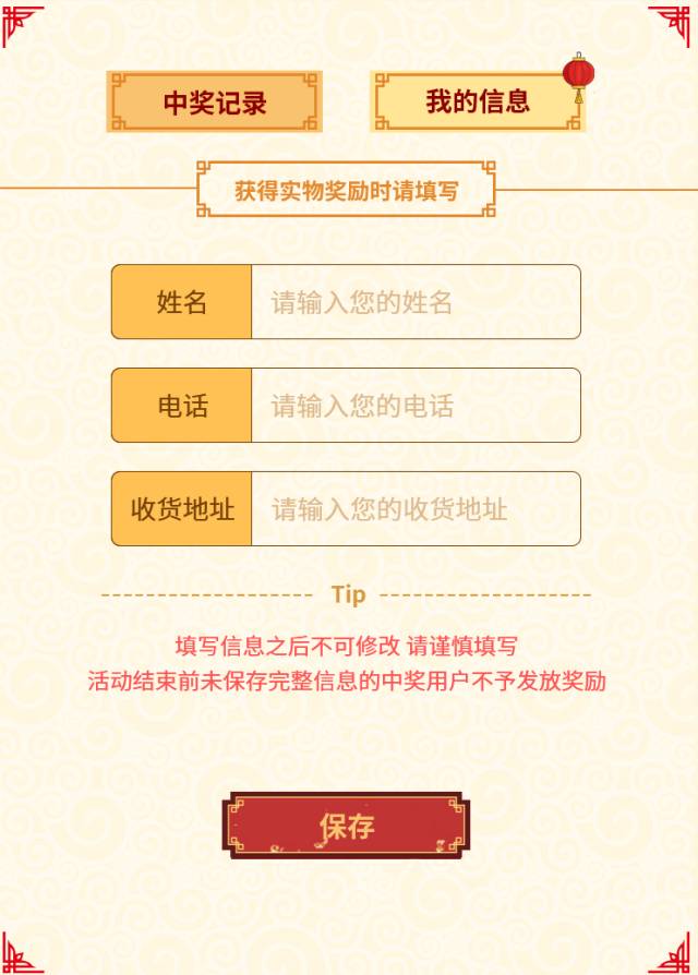 2、斩获实物奖励的玩家请注意:在您抽中实物奖励后,将会弹出一个收集信息的小弹窗(如下所示)。请在此弹窗中认真填写收货者的姓名、地址以及电话等联系方式。