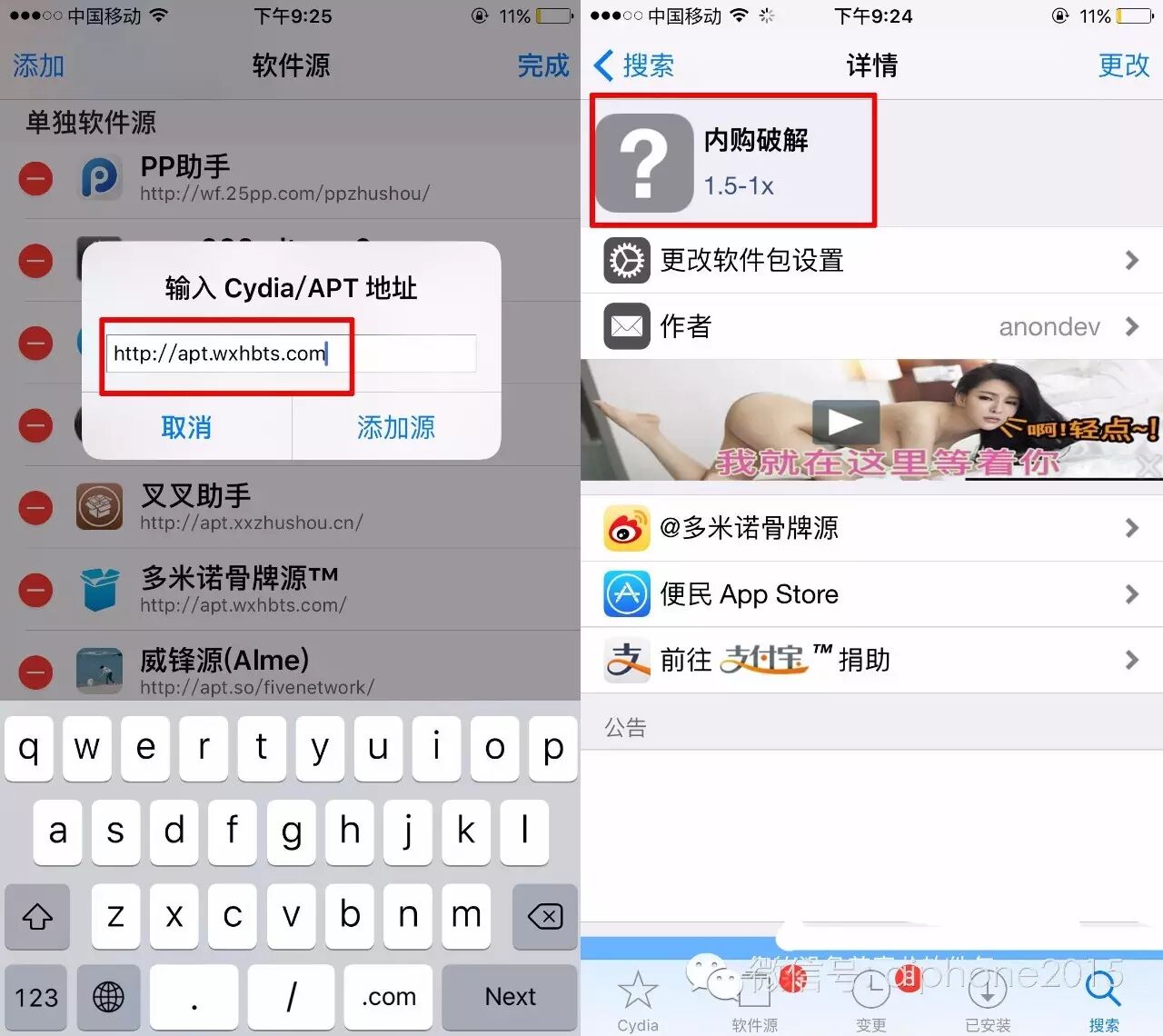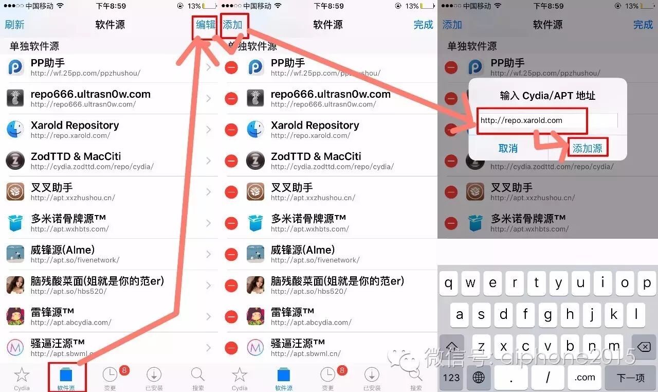 首先打开Cydia图标,软件源-编辑-添加:repo.xarold.com 如下图所示↓