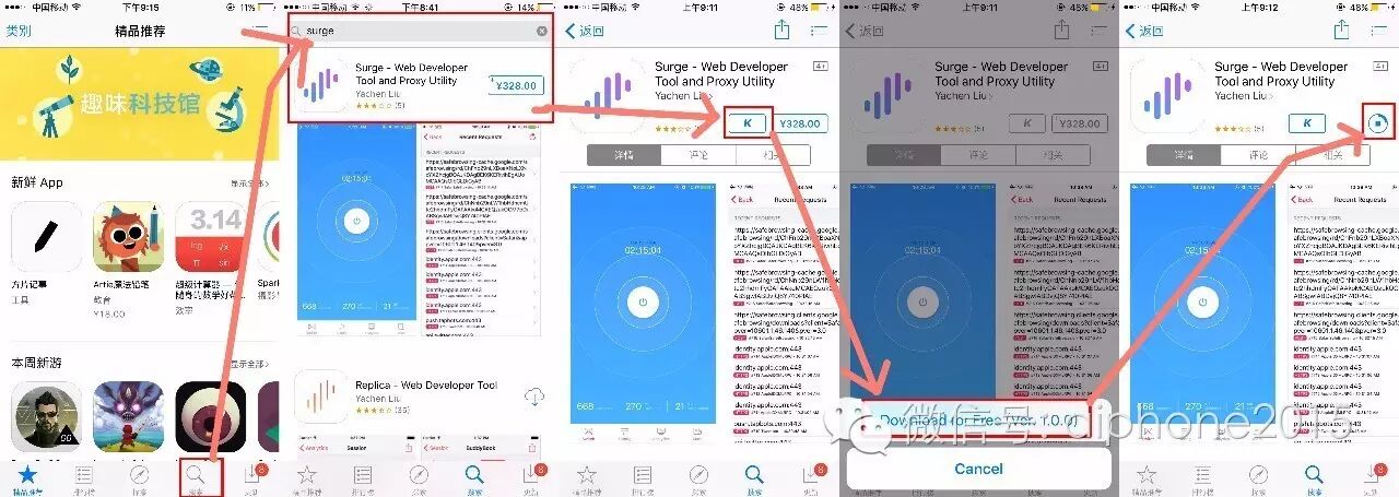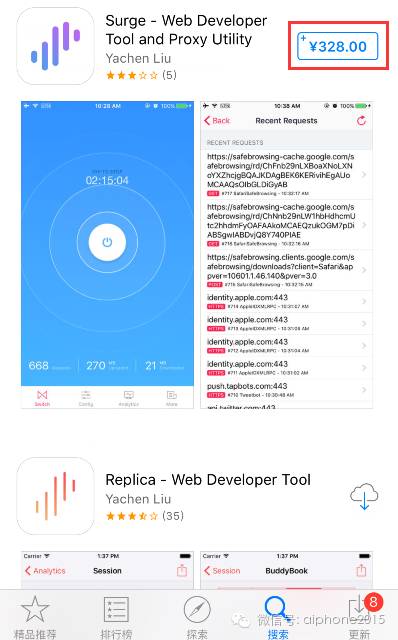 安装完成后,打开AppStore图标,搜索“surge”找到328元哪款,打开点击K即可免费下载,意味着成功破解。如下图所示↓