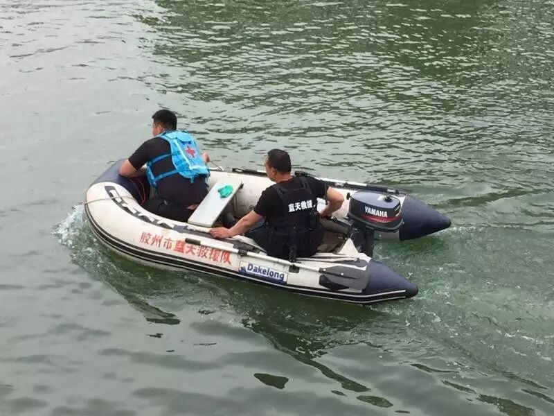 接到求助电话后,胶州市蓝天救援队4车12人携带冲锋舟、排钩、潜水装备等赶到救援现场展开救援。