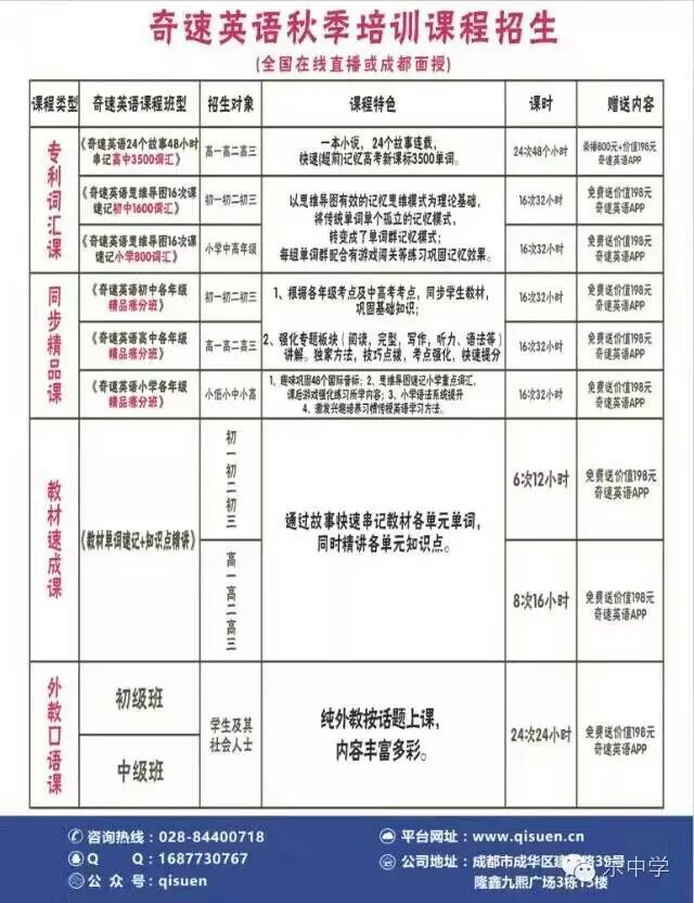 奇速英语小学词汇今晚7:30开课;初中词汇明晚7:30开课; 高中词汇明晚7:30开课。今明天报名,送价值140元的英语教材(含:词汇速记书,所在年级的周周测、周周练、时文阅读)。