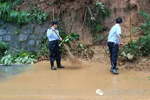 6月28日中午时分,天空骤暗,暴雨如注。面对急速上涨的秦坑河水位,正在泾川镇秦峰村办案的泾川森林派出所民警敏锐的意识到,由于连续降雨,山体蕴水过量,按照以往惯例,辖区内傍山而建的322省道很有可能出现山体滑坡,如不及时处置,将对车流量较大的322省道行车安全构成重大威胁。作为共产党员、,关键时刻,我们的岗位应该在防汛抢险的第一线。匆匆用餐后,泾川森林派出所即根据事先拟定的防汛工作预案,全体民警携带好必要的防汛器材,立即驱车沿322省道进行巡查。当警车行至泾川镇城西社区曹家组路段时,一处险情同时映入了众民警的眼帘:一块大小约二十平方米左右的塌方体裹挟着四、五株杂树和七、八棵毛竹,正横亘在本就不宽敞的322省道上。此险情如不及时排除,轻则形成“瓶颈”影响来往车辆的正常通过,重则造成“路障”危害途径人车的通行安全。