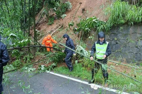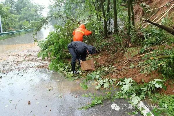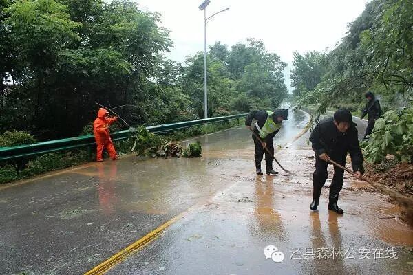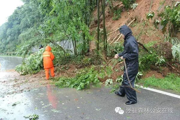 险情必须在最短时间内排除。见此情景,泾川森林派出所民警顾及不上公路上方山体土方仍极不稳定、随时有可能滑落的危险,一边迅速将警车警灯开启停放在路边,提醒来往人车注意避让,一边找来砍刀、铲锹等工具,和一名赶来的道班工人一道,对根部嵌在滑坡山体中的树木、毛竹进行清除。大家砍的砍、铲的铲、扫的扫、搬的搬,经近两小时的紧张冒雨“战斗”,原本占据了大半幅路面的滑坡山体和倒伏在路面上的树木,被泾川森林派出所民警及时清理干净,一处可能引起安全事故的重大隐患也在第一时间内得以有效排除。,甚至有不少乘客纷纷停下来用手机为忙碌中的民警留影。在确认隐患已经完全排除后,民警们顾不上休息片刻,马上又精神饱满的赶往了下一个险情处置点。
