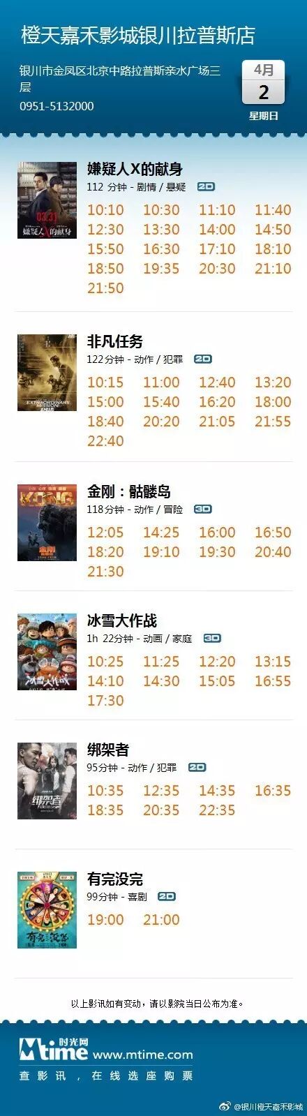 提示:本影讯来自网络,仅供参考,实时影讯请以影城实际排次为准。具体详情点击微信公众号下方“在线选座”链接查看,或登录嘉禾影城官网查询,还可拨打影城电话:0951-5132000咨询。